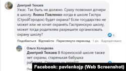 Родители крымских школьников в социальных сетях высказывают беспокойство относительно слабых мер безопасности в школах. На странице в Фейсбуке главы администрации Ялты Янины Павленко крымчане делятся опасениями по поводу отсутствия охраны.