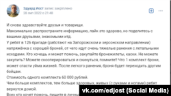 В соцсети ВКонтакте также появилась информация от россиянина, который собирает помощь бригаде. Пользователь соцсети по имени Эдуард Иост утверждает, что 126-я бригада находится на Запорожском и Херсонском направлениях и у нее «напряженка с хорошей броней, отчего идут очень тяжелые ранения с летальными исходами».