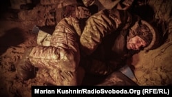 Это подразделение находилось в лесу в нескольких сотнях метров от позиций российских войск, пытавшихся прорвать украинскую оборону. Убежище представляло собой просто углубление в песчаной почве, возможно, глубиной в метр. Стволы деревьев и брезент служили потолком.