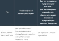 Крым.Реалии выяснили, что официально деятельностью в сфере рекламы Денис Кашук начал заниматься с 2011 года. Он оказывал посреднические услуги в размещении рекламы в СМИ. Его свидетельство предпринимателя до сих пор значится в украинском реестре как действующее.