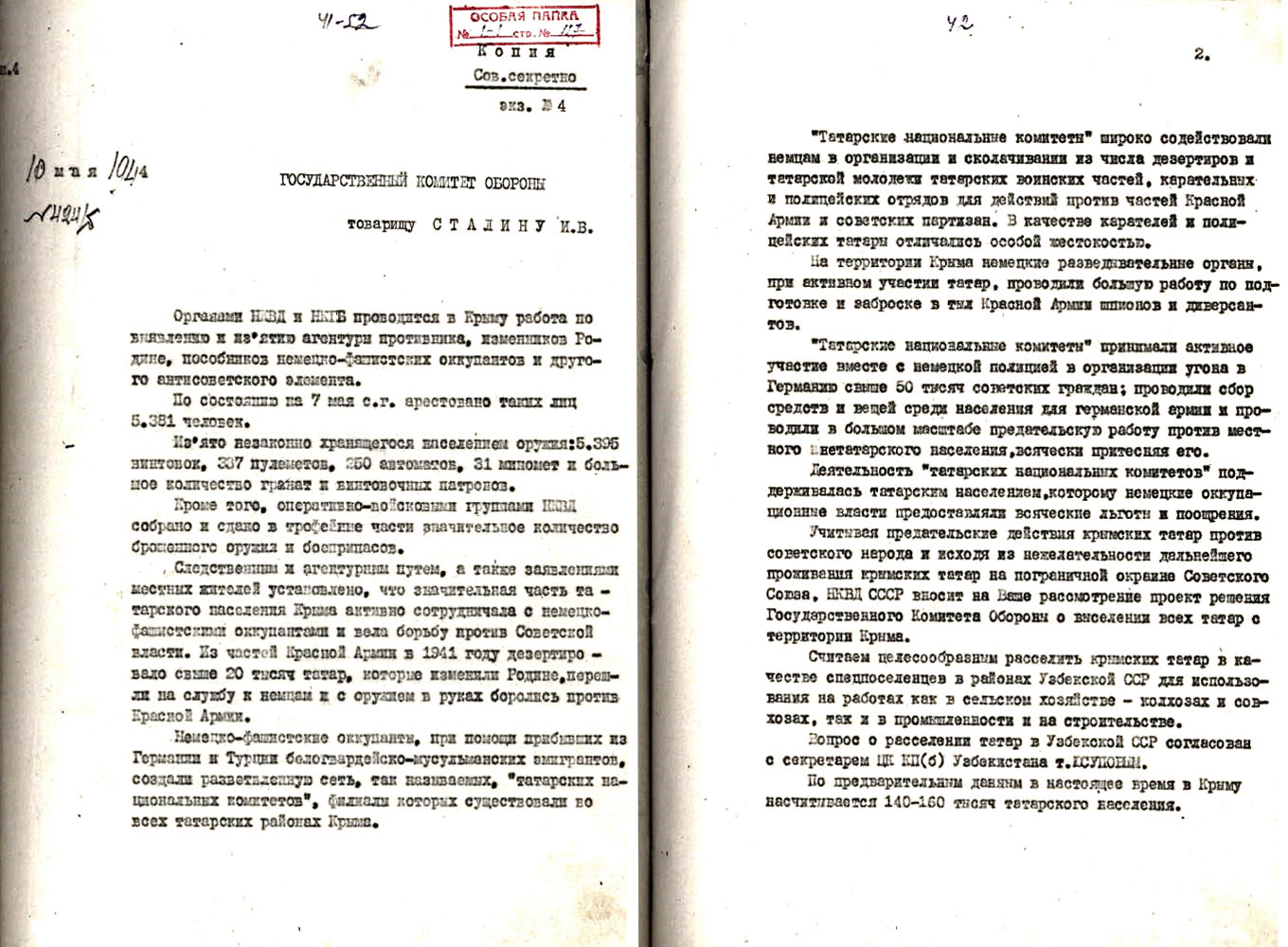 Письмо Лаврентия Берии на имя Иосифа Сталина о целесообразности депортации крымскотатарского народа. Называется подлинная причина депортации: «исходя из нежелательности дальнейшего проживания крымских татар на пограничной окраине Советского Союза»