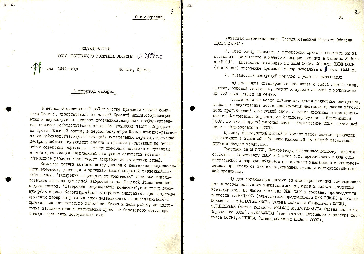 Приказ народного комиссара внутренних дел Лаврентия Берии и народного комиссара государственной безопасности Всеволода Меркулова «О мероприятиях по очистке территории Крымской АССР от антисоветских элементов». Переброска в Крым 20 тысяч бойцов НКВД