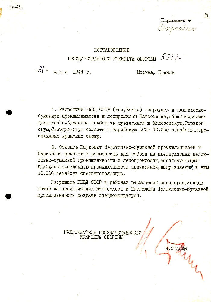 Постановление Государственного Комитета Обороны № 5937с о направлении в целлюлозно-бумажную промышленность и леспромхозы 10 тысяч семей депортированных крымских татар