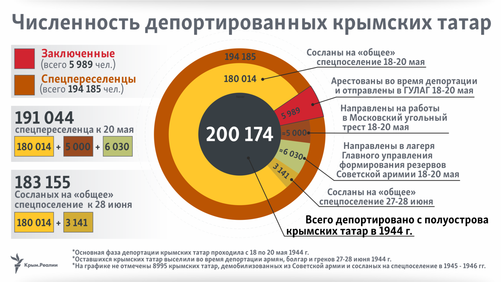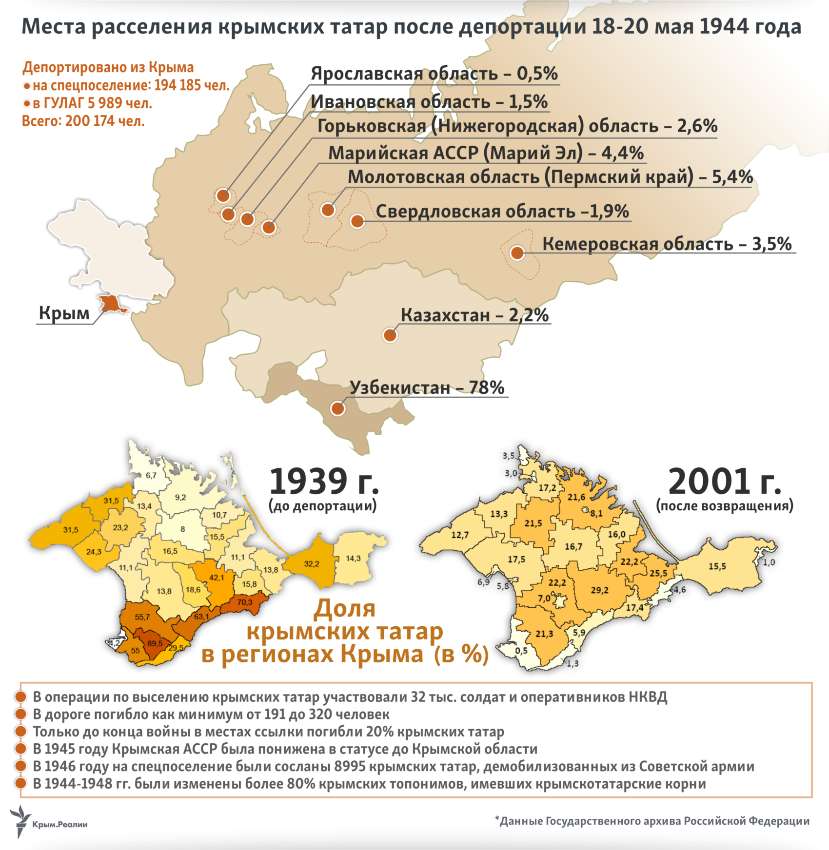 18 мая 1944 года сталинский режим осуществил еще одно преступление – без суда и следствия изгнал со своей родины и обрек на вечную ссылку весь крымскотатарский народ. В качестве предлога были использованы обвинения в массовом дезертирстве и коллаборационизме крымских татар, в 1967 году отвергнутые самой советской властью, но тиражируемые до сих пор. О подготовке к депортации и ее проведении, числе выселенных и местах изгнания рассказывают оригинальные документы и инфографика от авторов Крым.Реалии