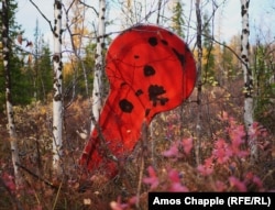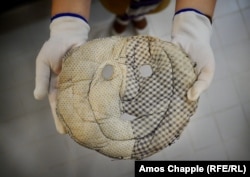 В самом большом музее в расположенном неподалеку Салехарде корреспонденту Радио Свобода сказали, что постоянной экспозиции, посвященной "дороге смерти", в городе нет. Однако сотрудники музея показали некоторые принадлежавшие заключенным предметы, которые хранятся в запасниках. Эта сшитая из клочков ткани маска спасала зимой от обморожения.