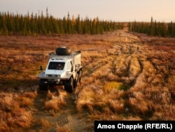 Летом по этим болотистым местам могут проехать только специализированные транспортные средства, как вездеход ТРЭКОЛ с бескамерными шинами со сверхнизким давлением: