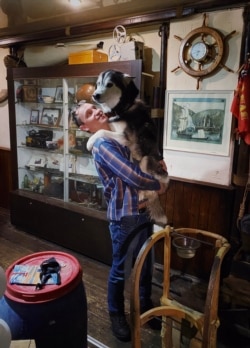 Бывший моряк Константин держит свою любимую собаку породы хаски.