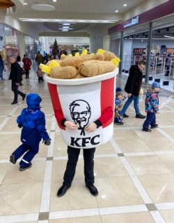 Ростовая фигура в форме ведра с жареной курицей и картошкой фри в одном из крупных торговых центров в Мурманске.