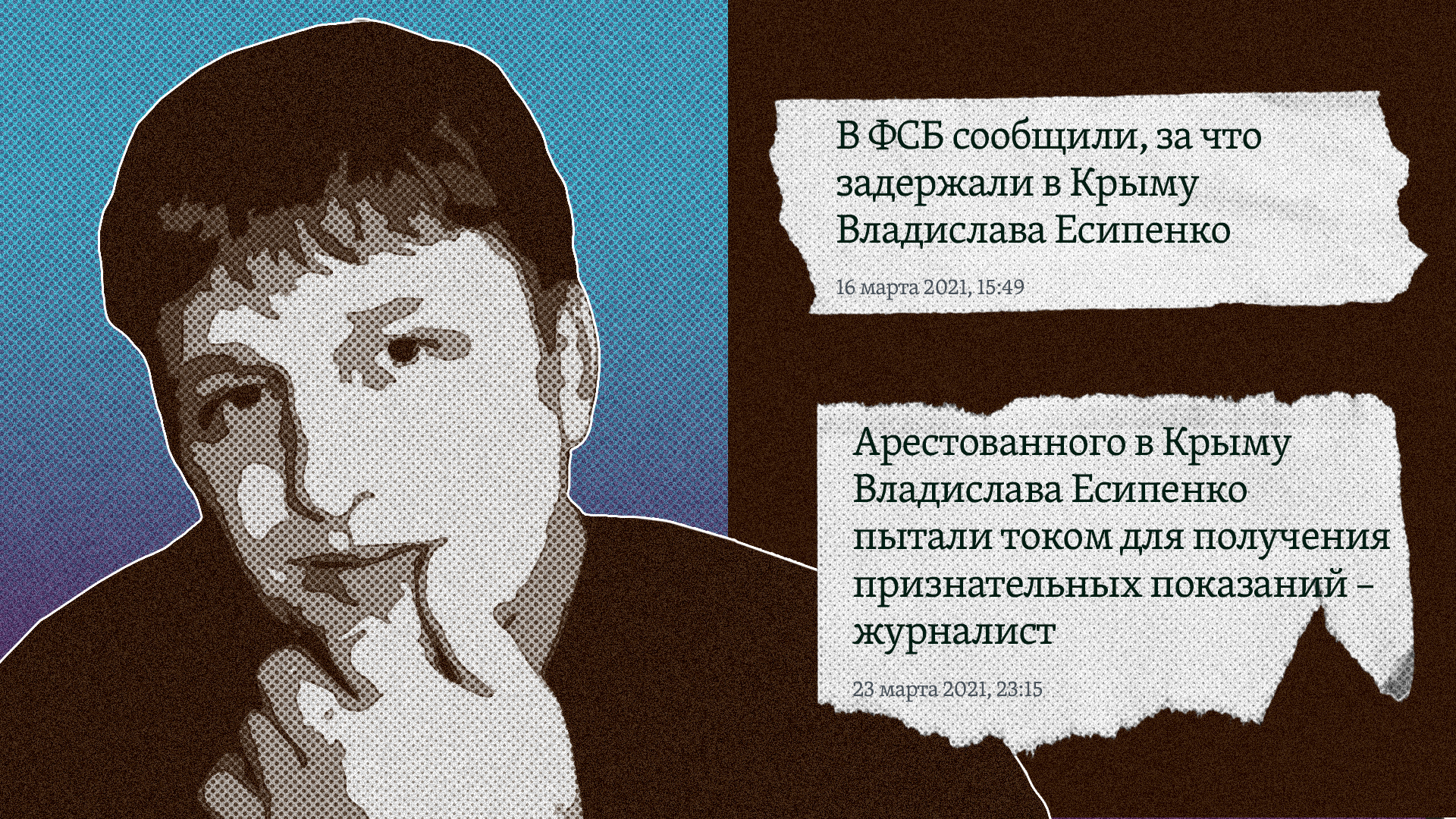 «Сегодня мы узнали, что Владислава Есипенко, задержанного в Крыму сотрудниками ФСБ 10 марта, два дня пытали электричеством. Надевали на голову что-то, подключали ток и постепенно увеличивали, когда он привыкал»