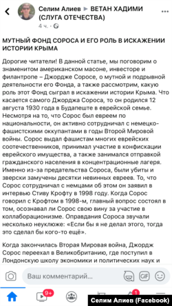 Автор сходу обвиняет Джорджа Сороса в… «активном сотрудничестве с немецко-фашистскими оккупантами в годы Второй мировой войны». Один из читателей сразу же возразил: «То есть в 9 лет (Джордж Сорос родился 12 августа 1930 года – авт.) он уже сотрудничал с немцами? При чем здесь Сорос, если еще при СССР в школе так и говорили, что крымских татар не существует и они пришли с монголами». Второй читатель: «Историю крымских татар исказили еще до рождения Сороса». Но администратор страницы Селим Алиев стоит на своем: «То, что на его деньги переписали историю – это еще полбеды. Страшное его преступление – это то, что он сеял смуту и спонсировал революции».