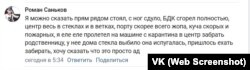 «Я, можно сказать, прям рядом стоял, с ног сдуло, БДК сгорел полностью, центр весь в стеклах и в ветках, порту, скорее всего, жопа, куча скорых и пожарных, я еле-еле пролетел на машине с Карантина в центр забрать родственницу, у нее дома стекла выбило, она испугалась, пришлось ехать забирать, хочу сказать, что это просто ад», – пишет Роман Саньков.