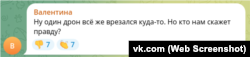 «Ну, один дрон всё же врезался куда-то. Но кто нам скажет правду?» – интересуется пользовательница под ником Валентина. На ее вопрос никто не ответил.