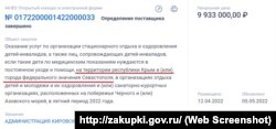 На эти средства, согласно документам, планируется оздоровить в Крыму 200 российских детей льготных категорий. Где именно их разместят на полуострове, из документации неизвестно. Но в условиях закупки говорится, что дети, которые по медицинским показаниям нуждаются в постоянном уходе и помощи, должны быть размещены в организациях отдыха и оздоровления молодежи, расположенных на побережье Черного и (или) Азовского морей в Крыму или Севастополе нынешним летом.