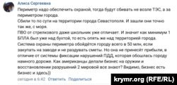 Пользовательница под ником Алиса Сергеевна подсказывает способ решения вопроса с защитой города: «Периметр надо обеспечить охраной, тогда будут сбивать не возле ТЭС, а за периметром города. Сбили то, по сути, на территории города Севастополя. И зашли они точно так же, с моря. ПВО от стрелкового даже школьник уже отличает. И, значит, как минимум 1 БПЛА был уже над бухтой, то есть опять же над территорией города». Также она сомневается, что власти займутся данным вопросом, так как на этом невозможно заработать.
