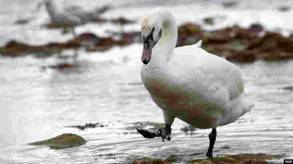 По берегу Каламитского залива, который омывает Евпаторию с юга, вышагивает белый лебедь.