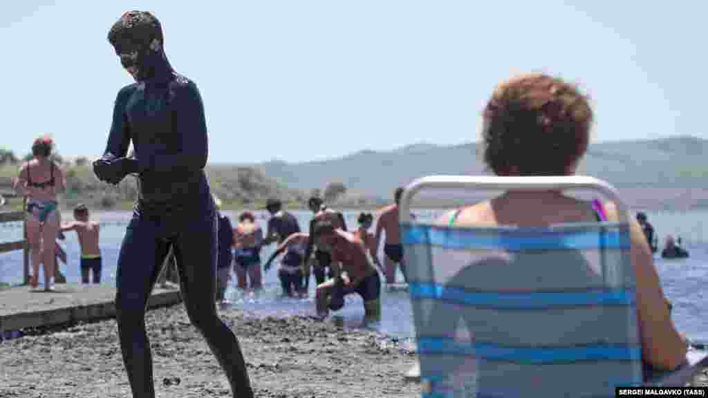 Отдыхающие во время приема грязевых ванн на озере Чокрак в поселке Курортное Ленинского района.