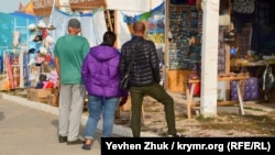 У ларька с сувенирами – туристы. Севастопольцам вещицы «на память» о родном городе совершенно ни к чему. Продавцы интереса к потенциальным покупателям не проявляют, сидят в глубине, уткнувшись в телефоны.