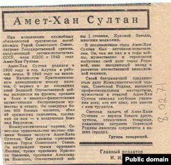 Прославленный летчик Амет-Хан Султан похоронен в Москве на Новодевичьем кладбище… Его могила в Москве – место паломничества крымских татар из всех регионов проживания. Его именем названы улицы в Алупке, Волгограде, Жуковском, проспект в Махачкале, площадь и аэроклуб в Симферополе, горный пик в Дагестане; лицей-школа № 8 города Каспийска Республики Дагестан.