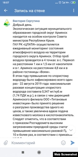 «В связи с этим правительство республики взяло под особый контроль экологическую ситуацию в Армянске, однако с тех пор никаких отклонений не было. В настоящий момент концентрация хлорида водорода и диоксида серы в атмосферном воздухе городского округа Армянск в норме», – заявил представитель Минэкологии Крыма в телефонной беседе с местной жительницей.