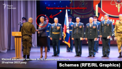 В подтверждение системного сотрудничества Минобороны РФ с «Газпромбанком» говорят и найденные «Схемами» фото и видео с публичных мероприятий разных воинских частей весной 2022 года. На них присутствовали официальные представители банка как финансовые партнеры армейских подразделений. В частности, в марте, во время празднования юбилея подразделения Росгвардии, на которое был приглашен представитель банка, как финансовый партнер подразделения.