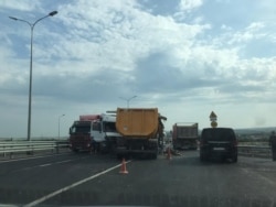 Утром 12 июня в Крыму на трассе «Таврида» произошло ДТП с участием двух грузовиков, из-за чего образовалась автомобильная пробка, сообщает корреспондент Крым.Реалии.