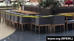 Корреспондент Крым.Реалии заметил в симферопольском торговом центре «Южная галерея» сотрудников российской полиции, которые обходили территорию и контролировали исполнение указа. При этом места за столиками в фуд-зонах затянуты строительной лентой и ярким скотчем.