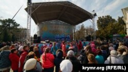 Как сообщает корреспондент Крым.Реалии, во время праздничного мероприятия по периметру сквера установили металлические ограждения, а на двух входах – рамки металлодетекторов, возле которых дежурили российские полицейские.