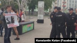 После начала акции сотрудники российской полиции подошли к Константину Котову для проверки документов.