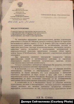 В российской прокуратуре утверждают, что Диляра Сейтвелиева является «участником (организатором) указанных массовых мероприятий».