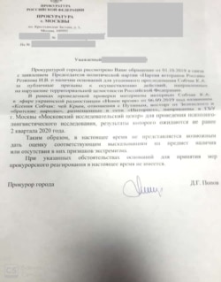 «В рамках проведенной проверки материалы интервью Собчак К.А. в эфире украинской радиостанции «Новое время» (...) направлены в ГБУ города Москвы «Московский исследовательский центр» для проведения психолого лингвистического исследования, результаты которого ожидаются не ранее 2 квартала 2020 года», – говорится в ответе прокуратуры