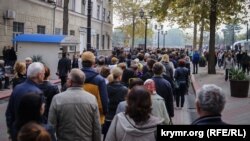 Тысячи людей приходят на центральную площадь Керчи, где в пятницу 19 октября происходит церемония прощания с жертвами массового убийства в политехническом колледже.