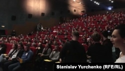 В ходе церемонии зрители в зале подняли над головой плакаты с надписью FreeSentsov.