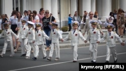 В Севастополе 19 мая прошло праздничное шествие по проспекту Нахимова, приуроченное к российскому Дню детства и юности. Как сообщает корреспондент Крым.Реалии, члены детской организации «Всероссийское движение школьников» маршировали в пионерских галстуках.
