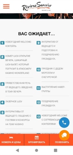 Так, например, на сайте алуштинского отеля «Riviera Sunrise» посетителям на момент подготовки материала открыто обещают: шикарный шоу-балет, лазерное шоу, интерактивы от ведущего, общение с гостями и конкурсы, танцевально-акробатическое шоу, праздник с Дедом Морозом и Снегурочкой, выступление кавер-группы, а также яркое пиротехническое шоу.