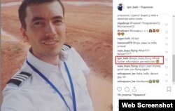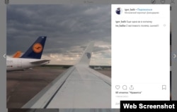 - 22 июля. Байбаков делает пост, на котором виден одномоторный самолет Cessna 182. Подпись переводится на русский так: "Диспетчер говорит: ваш самолет слишком мал, мы не видим его в небе". Радио Свобода удалось установить его регистрационный номер – RA-67717 (подробнее см. врезку).