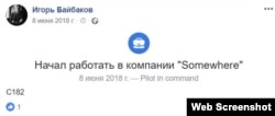 - 8 июня. Байбаков отмечает в Фейсбуке, что начал работать на новом месте (оригинал поста, сохраненная копия). Название компании он не называет, заменяя его на таинственное "Somewhere" ("Где-то"), но пишет в посте "С182" – так сокращенно обозначают модель одномоторного самолета Cessna 182, одной из самых популярных и массовых машин в истории мирового авиастроения (с 1956 года выпущено более 25000 единиц).