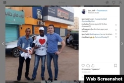 - 18 июня. Байбаков публикует в Инстаграме фотографию из столицы Судана Хартума. На ней он позирует с местными жителями, которым, судя по всему, подарил перед этим сувениры из России. Снимок (сейчас уже удаленный) сделан в районе торговой улицы Pepsi St., расположенной недалеко от международного аэропорта Хартума. Можно предположить, что именно в Хартум Байбаков и отправился из Москвы 7 июня – "Египетские авиалинии" в 2019 году предлагают самые удобные и дешевые билеты на рейсы из Москвы в суданскую столицу через Каир на эти даты. Напомним, в Хартум как минимум с августа 2018 года регулярно летают самолеты Минобороны, "Новая газета" засекла здесь бизнес-джет Евгения Пригожина, западные СМИ писали не только о бизнес-интересах "повара Путина" в Судане, но и об участии российских военных инструкторов в подавлении антиправительственных беспорядков в стране.