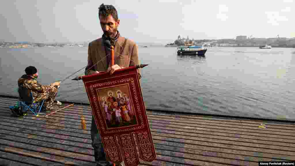 Севастополь: православный верующий стоит на пирсе, где завершился крестный ход, посвященный годовщине так называемого «Русского исхода» – эвакуации из Крыма Белой армии и населения в 1920 году. По разным данным, под угрозой красного террора полуостров покинуло от 136 до 160 тысяч человек. На 126 судах они ушли в Турцию и Тунис.