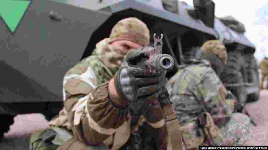Под Севастополем в горах сотрудники российского ОМОН «Беркут» проводят очередные учения, в ходе которых проводятся стрельбы из боевых машин. Бойцы развернули лагерь и живут в условиях, «максимально приближенных к боевым». Военнослужащие разбили палатки: штаб, учебный класс, медпункт, и полевая кухня.