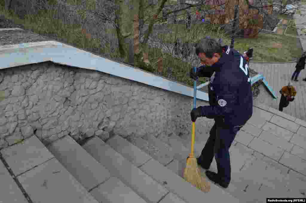 Участники уборки подметали дорожки Горсада выкрашенными в желтый и голубой цвета метлами, убирали мусор в желтые и голубые пакеты. Женщины вплетали в волосы желто-голубые ленты, а мужчины были с флагами Украины.