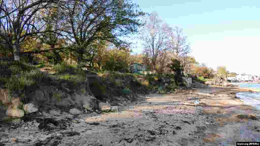 На пляже разрушена опорная стена из местного ракушечника, защищавшая береговую линию от оползней. Каменная кладка рухнула на пляж, на песке и в кромке прибоя лежат груды камней.