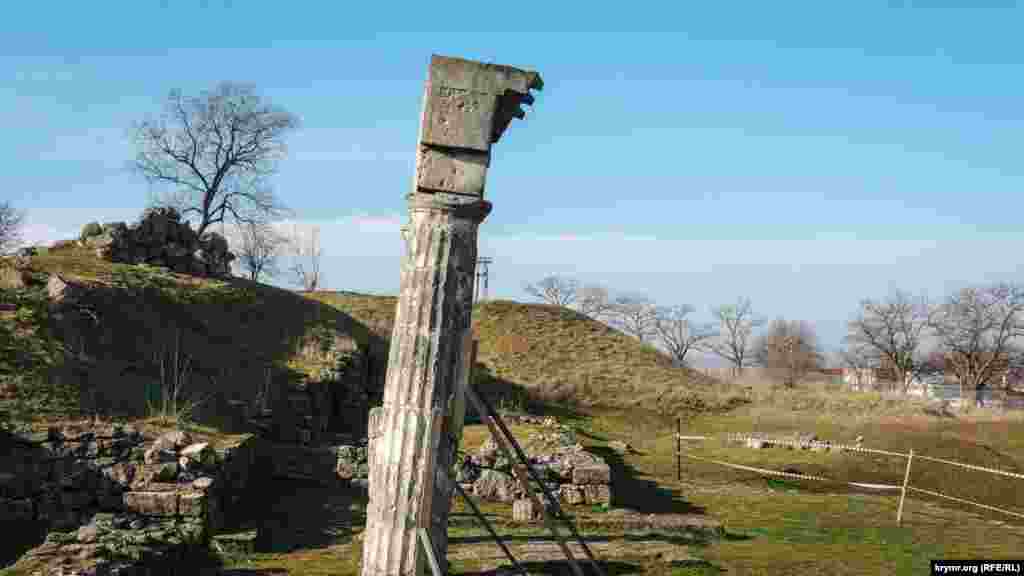 В центре Керчи с вершины горы Митридат над городом возвышаются руины древнегреческого Пантикапея. До наших дней от столицы Боспорского царства сохранились остатки стен зданий и башен, однако самой узнаваемой всегда была высокая арка с колоннами и резным каменным портиком. С недавних пор она оказалась под угрозой обрушения – каменные колонны сильно накренились и теперь их подпирают несколько металлических балок.