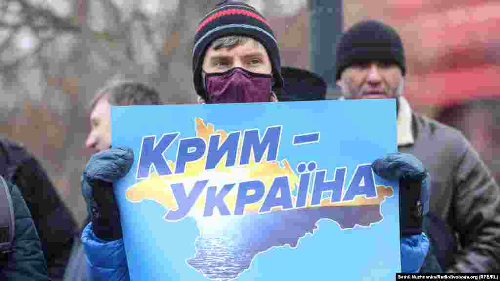 Участники акции держали в руках плакаты с надписью «Крым – это Украина», флаги Украины, крымскотатарский флаг, портреты политузников.