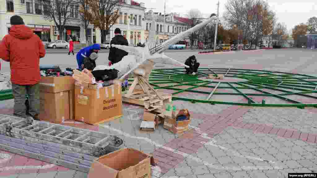 В Симферополе на площади Ленина рабочие начали монтаж конструкции главной городской елки. Размеры нового новогоднего дерева – порядка 24 метров. По данным российских властей Симферополя, завершить установку елки планируют до 19 декабря. Из-за пандемии коронавируса новогодние гуляния и торжественное открытие елки проводить не планируют.