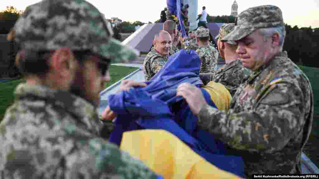 В Киеве вечером 22 августа, в преддверии Дня Государственного Флага Украины, подняли главный стяг страны. Он будет развиваться на высоте 90 метров над Печерскими холмами – именно столько составляет длина флагштока.
