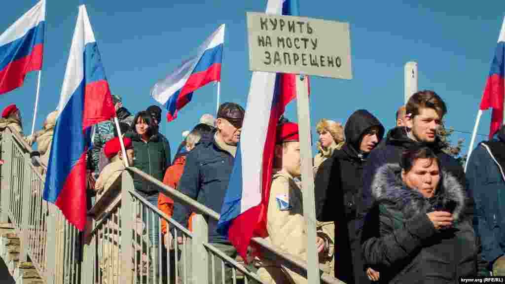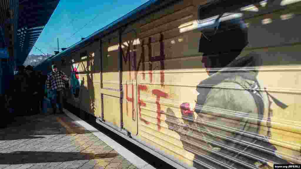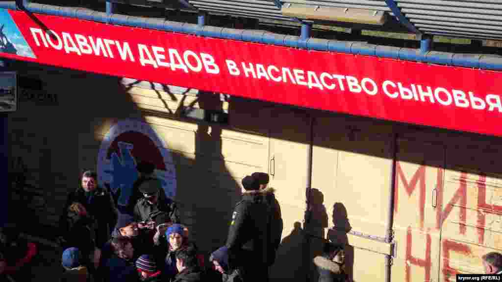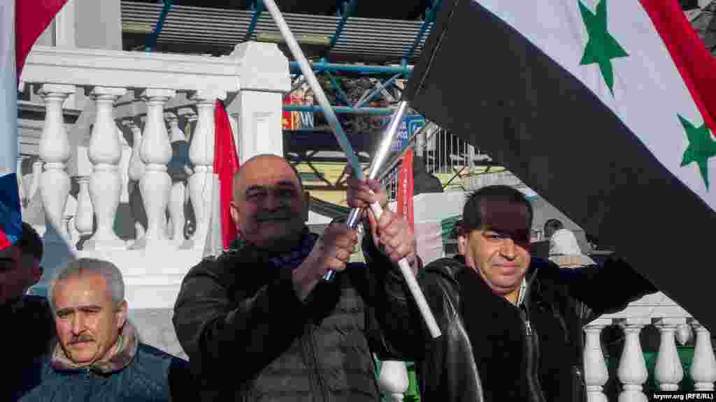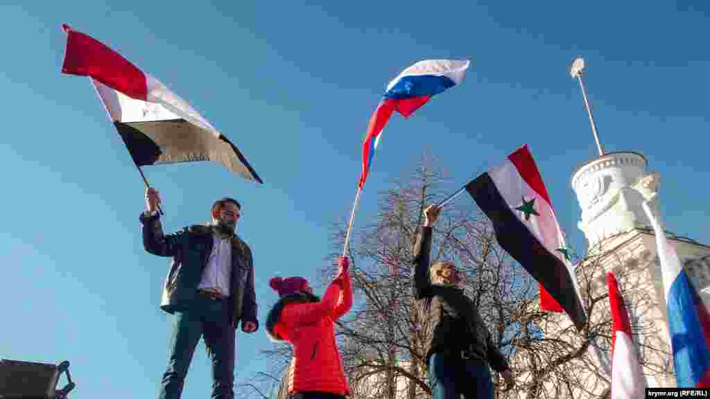 Позднее возле железнодорожной платформы с «трофейной бронетехникой» прошла акция представителей «Международного союза антифашистов Севастополя». Они развернули флаг Сирии и баннер с названием своей организации. По их словам, таким образом они протестовали относительно «распространения национализма и фашистской идеологии».