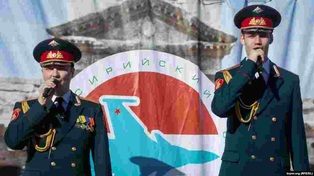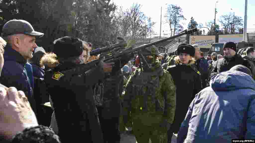 По информации корреспондента Крым.Реалии, вместе с передвижной выставкой в Севастополь приехали представители правительства Сирии. Два десятка сирийцев устроили импровизированный флешмоб: залезли на броневик и с криками «УРА!» размахивали российскими и сирийскими флагами.