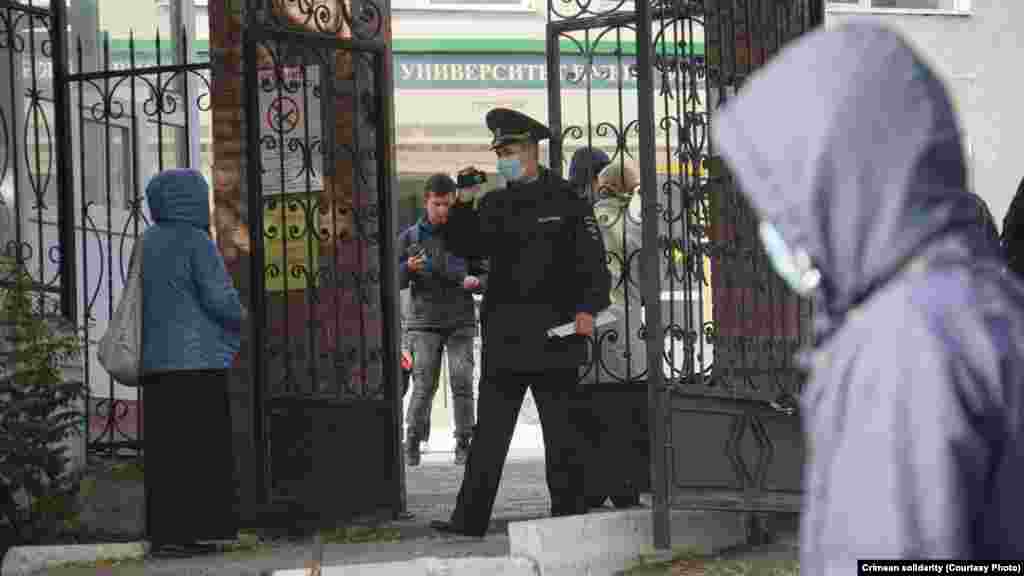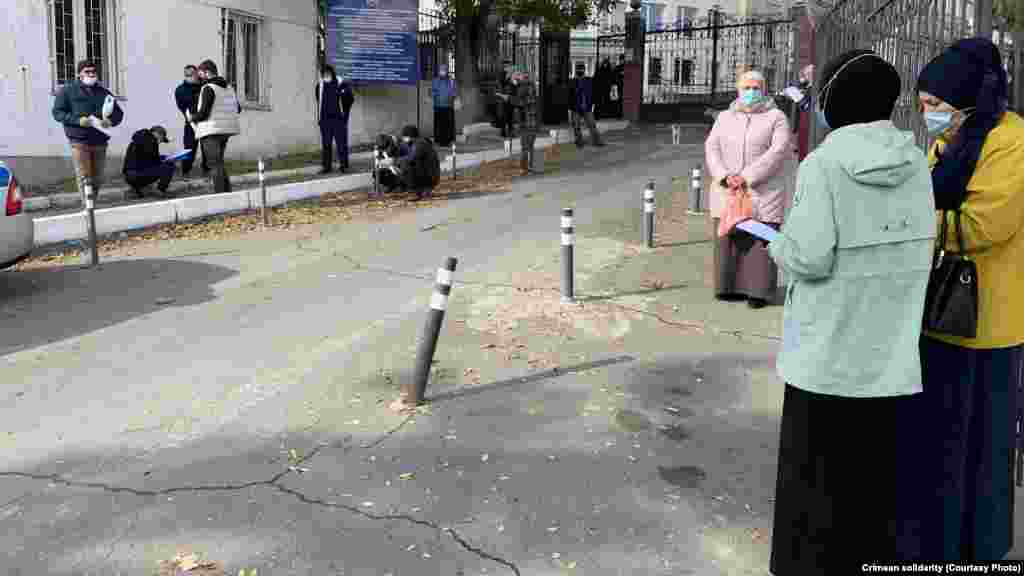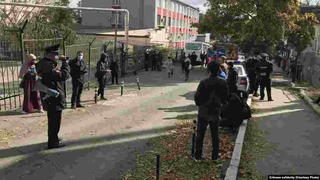 Утром 25 октября у здания Крымского гарнизонного военного суда в Симферополе собрались крымские татары, чтобы поддержать фигурантов красногвардейского «дела Хизб ут-Тахрир». В суде адвокаты по видеоконференцсвязи должны были принять участие в рассмотрении апелляционной жалобы на приговор по данному делу. Российские полицейские потребовали собравшихся разойтись, после чего сотрудники ОМОНа начали заводить собравшихся под судом в автобус, в том числе женщин.