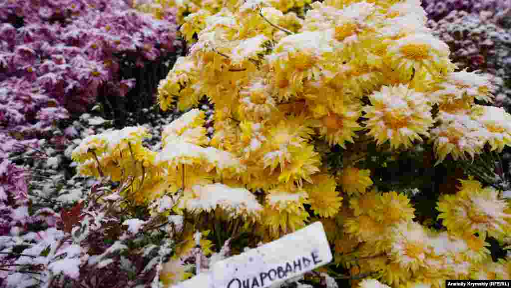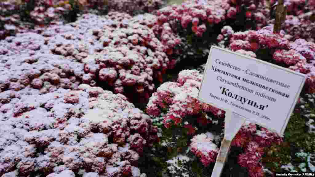 Нежные хризантемы всех сортов и расцветок слегка сгибаются под тяжестью белоснежных хлопьев. Снегом заметно припорошило зеленую траву и листву на деревьях. Видно, как засуетились садовникии ботсада. Даже из-за небольшого снега и холода резко поубавилось на аллеях любители утренней пробежки. Как-то притихли здешние голуби.