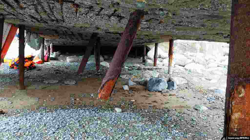 «Проход на причал закрыт» – такая табличка встречает отдыхающих на входе на «Золотой пляж» поселка городского типа Курпаты (Большая Ялта). Часть территории у моря здесь завалена бетонными плитами. Чуть поодаль – большое количество железобетонных волнорезов. Таким образом здесь спасают береговую линию от штормов.